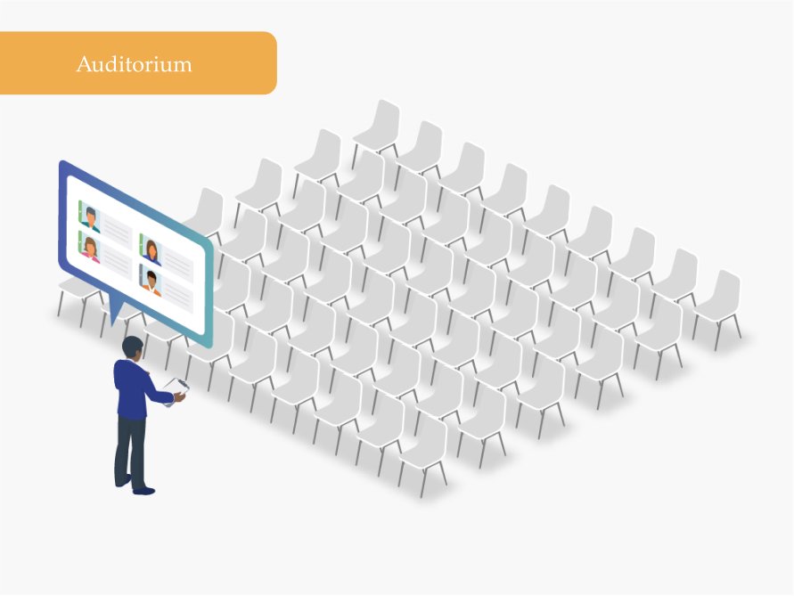 Auditorium seating features rows facing a stage or podium—ideal for large speaker sessions.