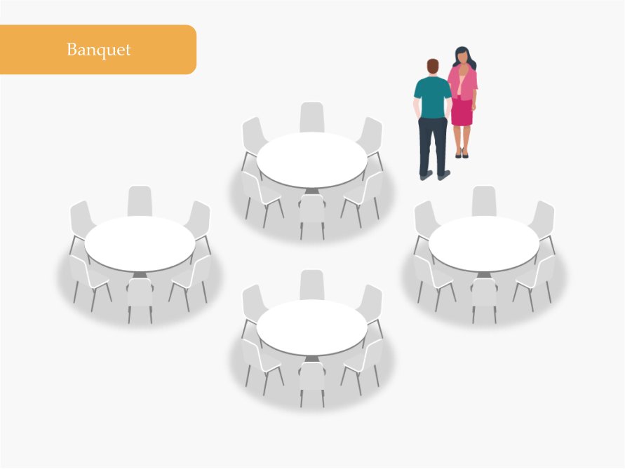 Banquet seating uses round tables seating 8–10 guests for comfortable group interaction.