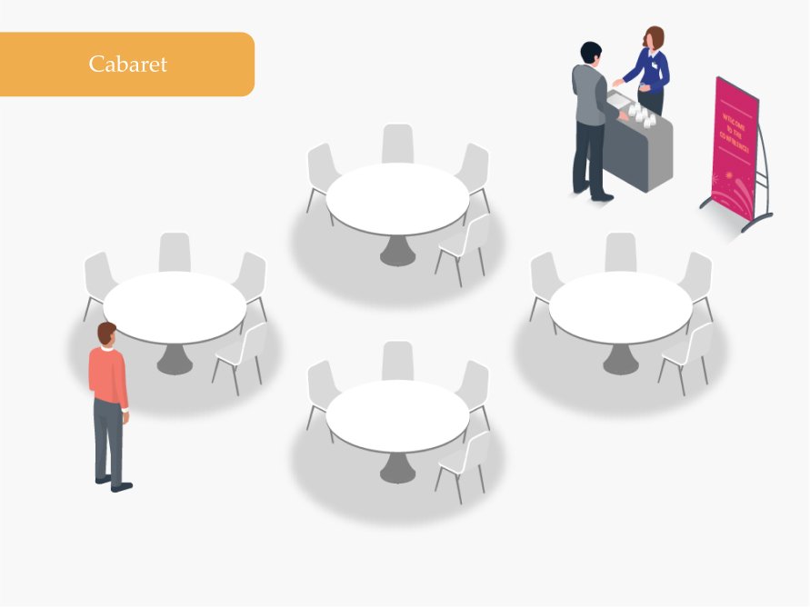 Cabaret seating uses semi-circle tables open toward the stage, perfect for relaxed engagement.