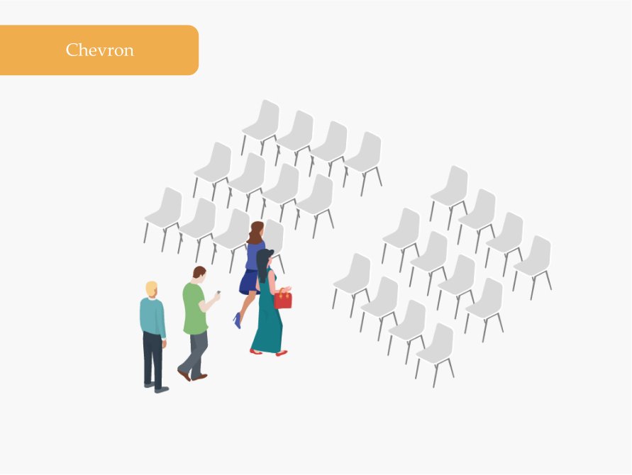 Chevron seating features two columns of angled rows with a central aisle. A focal point enhances participation and discussions.