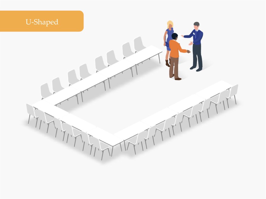 U-shaped seating promotes collaboration with open-ended table arrangement.